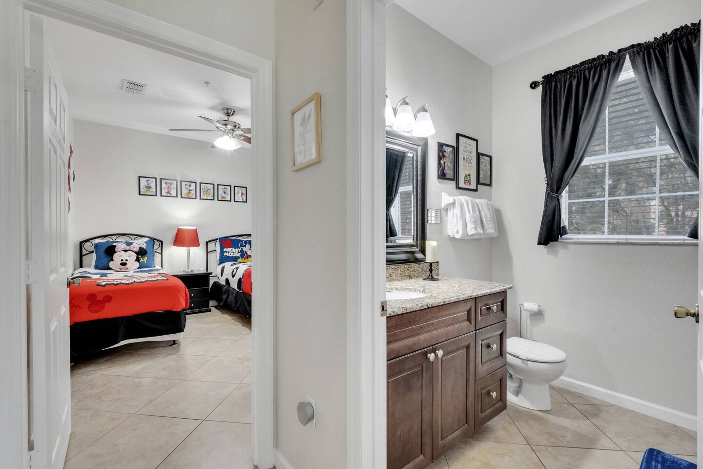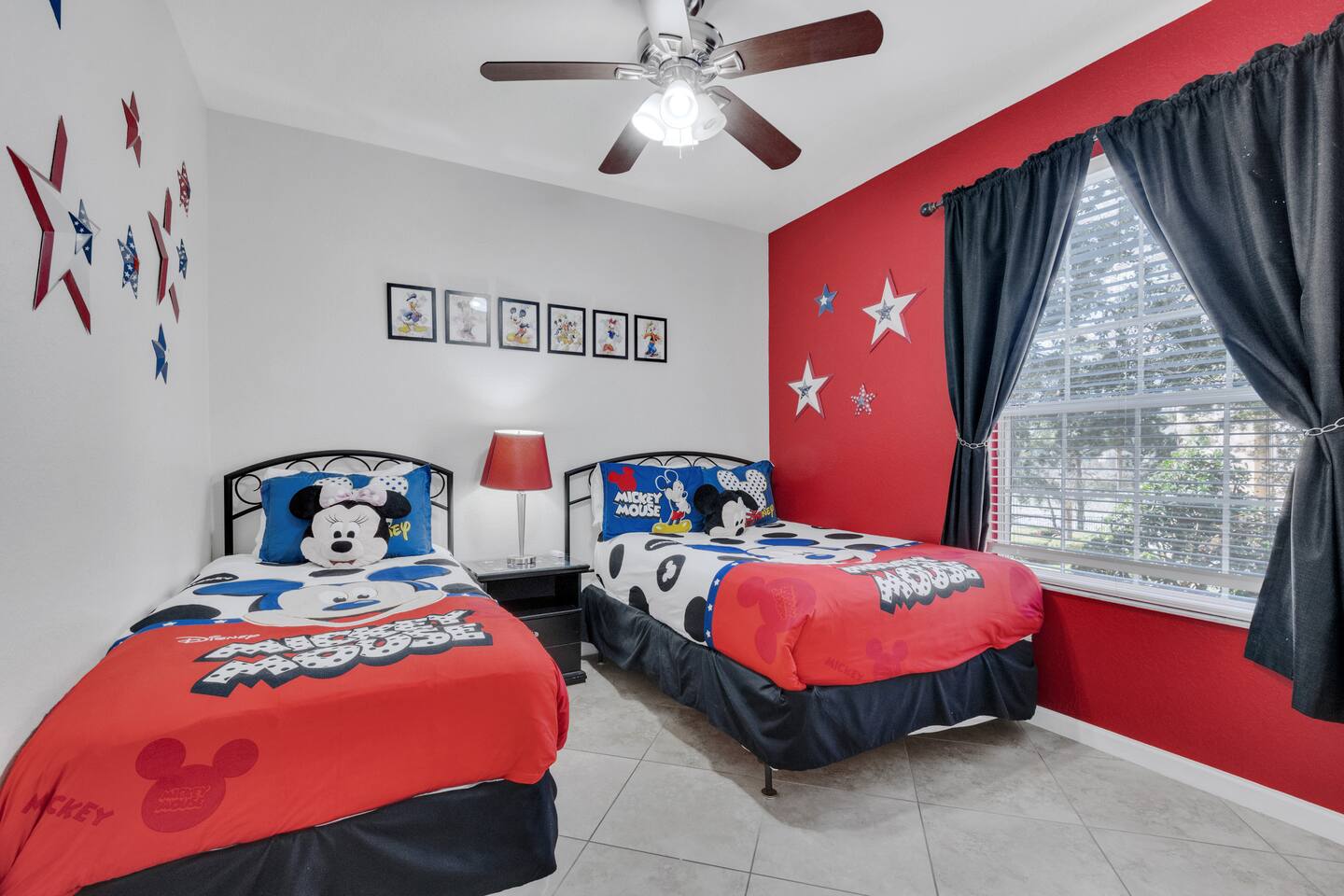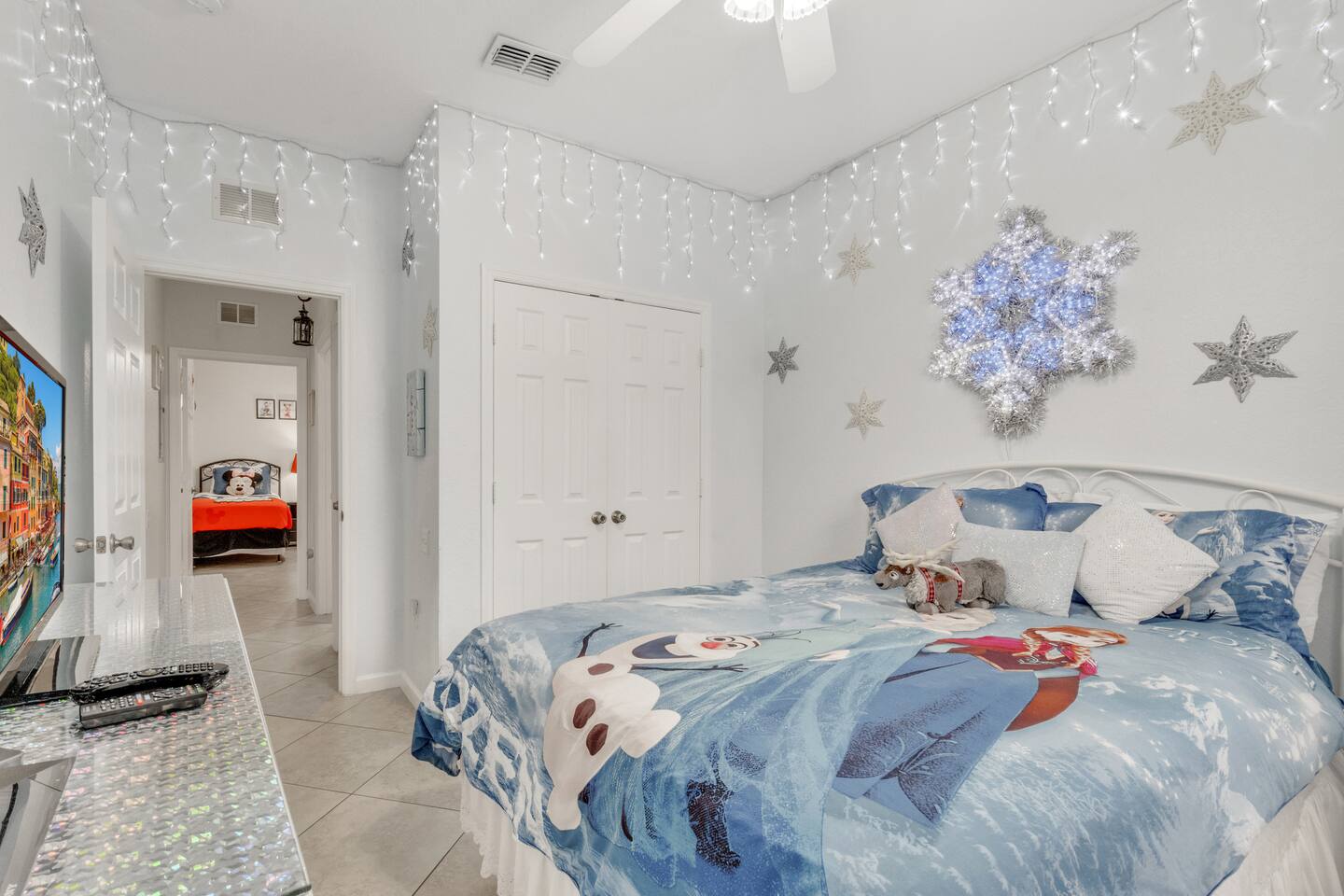 ***Pool and hot tub open, but the Waterpark and Slides will be closed for maintenance from January 5 to February 14, 2026. **** Pay ZERO resort fees when you stay with us — all of the amazing amenities are included at no extra charge. Plus, this building is the closest to the resort’s pool and waterpark, giving you unmatched convenience. Families will also appreciate the thoughtful extras: a Pack ’n Play, high chair, and children’s essentials are provided to make your stay stress-free. One of the closest resorts to Disney filled with so many fun activities and events that Windsor Hills hosts for their guests. We'll provide a calendar of all the activities as you arrive, and what a great place to disconnect, relax, and be fully present with the people you love the most! Set up for families, this condo offers a split layout with the master suite on one side and two themed bedrooms plus a hall bath on the other. Bold bedding, creative lighting, and Disney-inspired touches keep the magic going even after you leave the parks. Living Room Unwind in the bright living room, featuring plenty of seating and Disney décor accents. Perfect for family nights or a quick recharge before heading back out to the parks. Highlights include: ✧ Comfortable seating for the whole crew ✧ Smart TV with streaming options ✧ Fun, cheerful décor ✧ Open connection to kitchen and patio Kitchen Fully stocked and family-ready, the kitchen makes mealtime easy — whether it’s pancakes in the morning, park snacks to-go, or dinner at the table. Highlights include: ✧ Full-size appliances ✧ Cookware, dishes, and utensils provided ✧ Dishwasher for easy cleanup ✧ Dining area for shared meals Master Bedroom The master suite brings color and comfort with a king bed and its own en-suite bathroom for extra privacy. Highlights of the master suite include: ✧ King-size bed with fun, colorful bedding ✧ Private en-suite bathroom ✧ Closet space for unpacking ✧ Smart TV for downtime Other Bedrooms & Bathroom The second bedroom is a Frozen-inspired retreat with icy lights, themed bedding, and artwork to delight kids and fans alike. The third bedroom keeps the Disney magic alive with Mickey & Minnie–themed twin beds. Both share a full hall bath. Highlights include: ✧ Frozen-inspired queen room with snowflake + icicle lights ✧ Themed bedding & art ✧ Mickey & Minnie twin room (2 beds) ✧ Shared full bathroom Outdoor Space Enjoy the screened patio for a quiet morning coffee or a relaxing evening hangout. Location We are only: ✧ 1.5 miles to Disney World! ✧ 15 minutes to Universal Studios ✧ Minutes to dining & shopping in Orlando/Kissimmee ✧ 25 minutes to Orlando International Airport Attention to Detail ✔ Sparkling clean on arrival ✔ Washer/dryer & detergent included ✔ Premium linens and essentials provided ✔ First aid kit in the kitchen